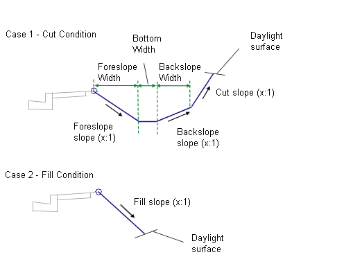 The attachment point is at the inside edge of the ditch foreslope for cut, and at the inside edge of the daylight link for fill.