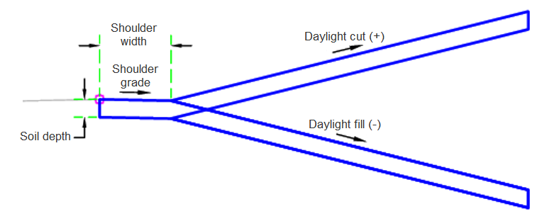 The ClarkCountyBasicDaylight subassembly inserts links to create cut or fill catch slopes with a shoulder. You can define a ditch in cut situations.