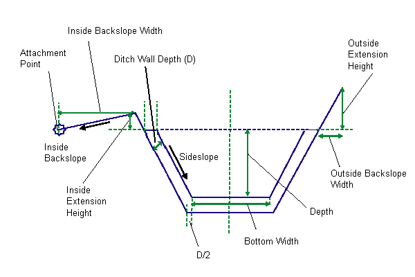 | Ditch Wall Depth | Depth of the ditch wall. This is measured perpendicular to the side of the slope, as shown in the previous diagram. | Numeric, Positive |