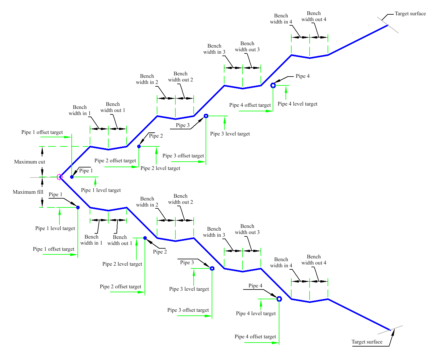 At each bench a pipe is inserted at a distance specified in the input parameters or overridden using targets for offset and level. A pipe size of 0 omits the pipe.