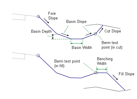 This subassembly inserts links to create a basin and cut daylight slope for a cut condition, or a basin, benching, and fill slope for a fill condition.
