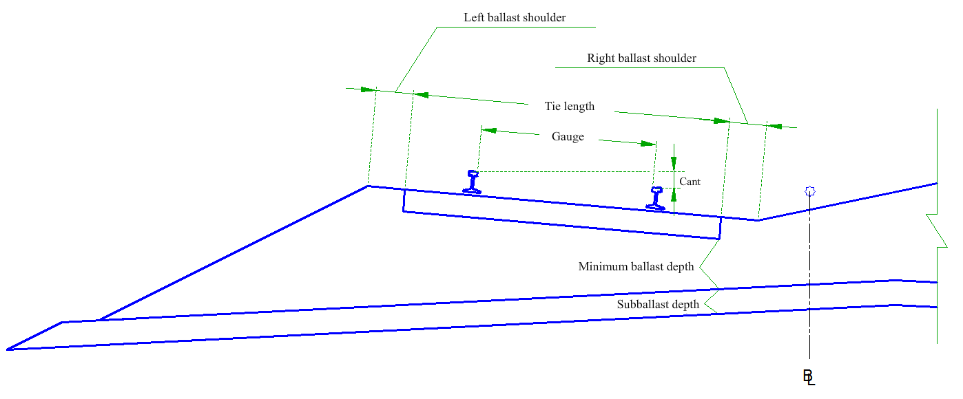 The Minimum Ballast Depth value applies at the location of the minimum clearance between the tie and subballast. The Subballast Top Slope parameter independently controls the subballast top slope . The Baseline to Subballast Crown parameter controls the location of the subballast crown.