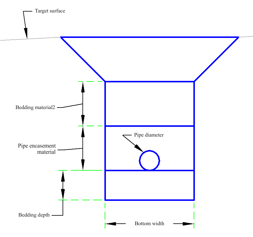 | Top Material Depth | Depth of the bedding over the pipe bedding. | Numeric, positive |
