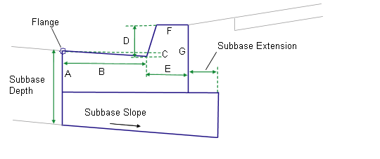 The kerb and channel links are inserted based on the Input Parameter dimensions Dimension A – Dimension F. All dimensions must be positive, non-zero values. If a non-zero subbase depth is given, the subbase layer is inserted to the back of kerb, and continues for the Subbase Extension width. The subbase layer closes to the bottom-back-of-kerb, as shown in the diagram.