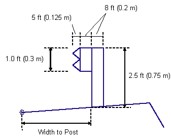A guardrail structure may be applied to fill sections that meet the criteria for using the steep fill slope. If this criteria is met, the Guardrail Width is not zero, and Include Guardrail is set to true, then a guardrail structure is drawn at the chainage. The dimensions of the guardrail structure are fixed as shown in the diagram below.