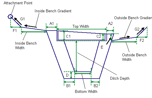 | Outside Bench Gradient | Cross gradient of the (optional) outside bench. It is measured away from the ditch structure edge, and a positive slope indicates rising bench from the ditch | Outside Bench Gradient | 4% |