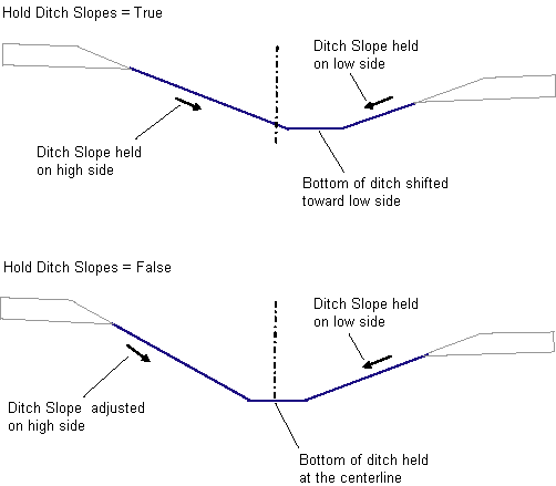 The top of the ditch slopes may be at different elevations on the left and right sides, resulting in an asymmetrical ditch. There are two options for handling this situation. If Hold Ditch Slopes is set to True, then the Slope 1 and Slope 2 values are held on both sides, shifting the bottom of ditch away from the centerline towards the lower side. If set to False, the ditch bottom is centered about the midpoint offset between the tops-of-slopes, the given slope is held on the lower side, and the slope is adjusted to match on the higher side.