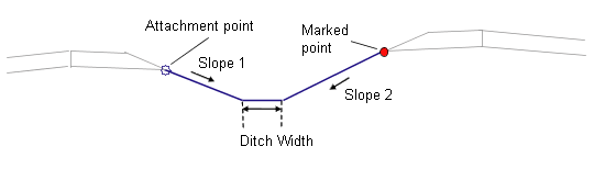 The locations of the attachment point and marked point are determined. The marked point may be either to the right or left of the attachment point. Links are extended inward at Slope 1 from the attachment point, and at Slope 2 from the marked point, until they intersect. If a ditch width is given, a horizontal bottom-of-ditch link is fit into the intersecting side slopes.