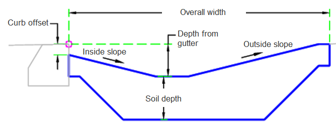 The initial point is set at the attachment point. The rain garden in then adjusted the entered offset distance. The depth of the rain garden is set from the input values.