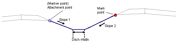 The locations of the attachment point and marked point are determined. The marked point may be either to the right or left of the attachment point. Links are extended inward at Slope 1 from the attachment point, and Slope 2 from the marked point, until they intersect. If a non-zero ditch width is given, a horizontal bottom-of-ditch link is fit into the intersecting side slopes.