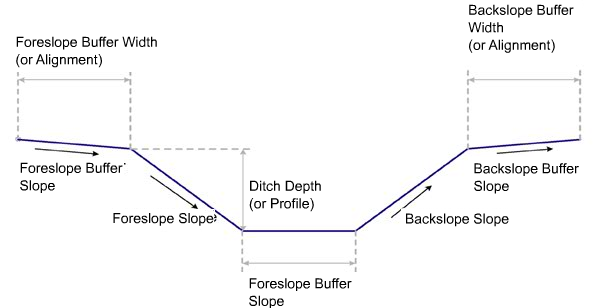 Ditch Inner Edge Alignment May be used to override the fixed width of the foreslope buffer. The following object types can be used as targets for specifying this: alignments, polylines, feature lines, or survey figures. Optional