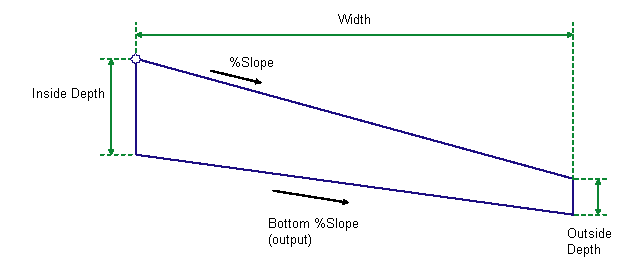 The finish grade of the shape is inserted for the given Width and % Slope outward from the attachment point. The bottom link slope is calculated based on the inside and outside depth of the shape. The point, link, and shape codes are set in the input parameters using the user-defined strings.