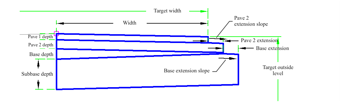 The finish surface of the shoulder is inserted for the given Shoulder Width and Default Shoulder Slope outward from the attachment point. The Pave2 points and links are then drawn. A Pave2 extension is provided using the input parameters. The Base points and links, including extension, are calculated using the input parameters. The Subbase points, links, and shape, including extension, are calculated using the input parameters.
