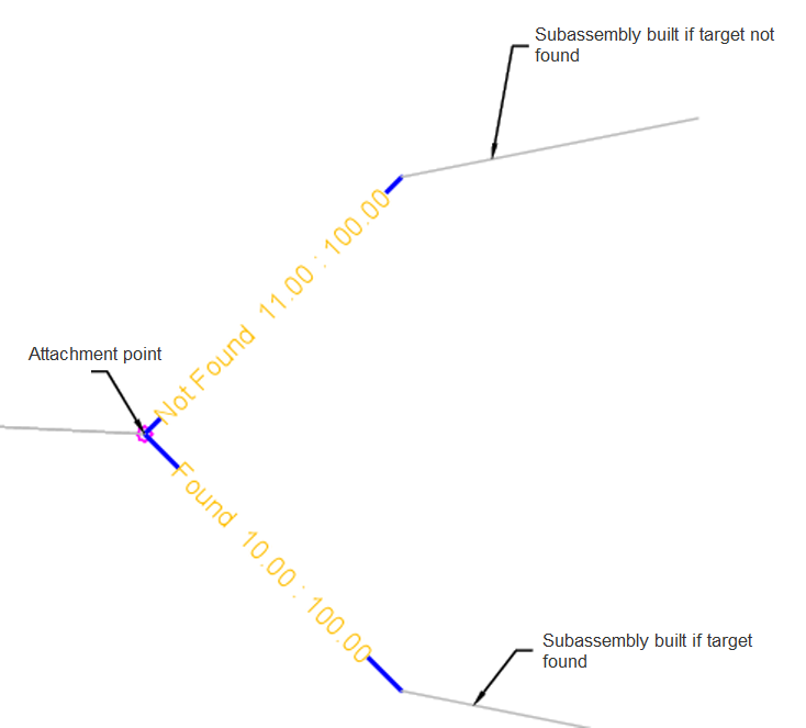 | Condition | Specifies the condition available for this subassembly. The Found condition is processed if the offset target is found within the maximum distance. The Not Found condition is processed if the offset target is not set or is not found at the chainage within the maximum distance. | Found/Not Found | Found |