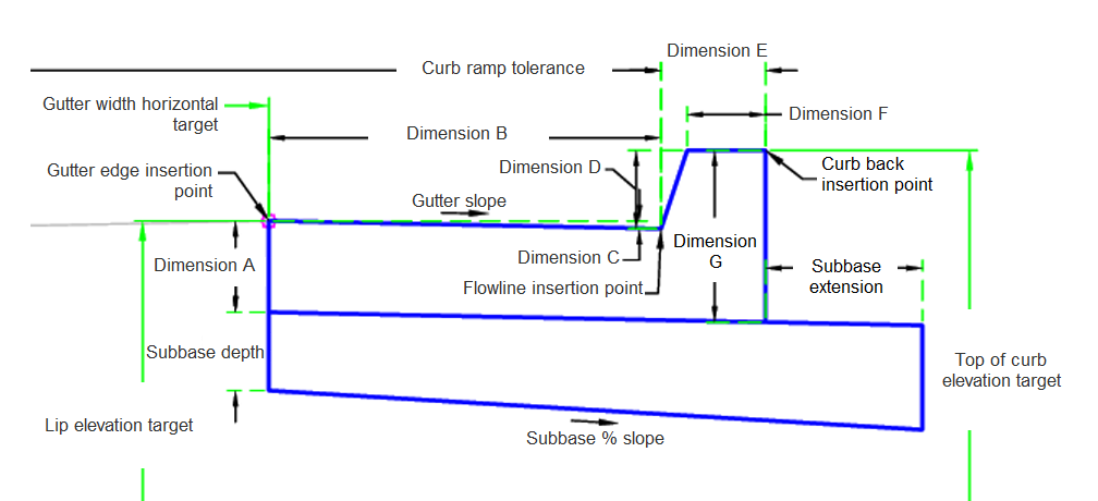 If the insertion point is other than GutterEdge then the channel width and slope is adjusted if the targets for the channel edge are present. The channel slope and level targets may need to be non-standard to meet accessibility requirements.