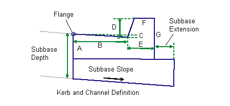 All other kerb and channel links are inserted, based on the Input Parameter dimensions Dimension A - Dimension F. All dimensions must be positive, non-zero values. If a non-zero subbase depth is given, the subbase layer is inserted to the back of kerb, and continues for the Subbase Extension width. The subbase layer closes to the bottom-back-of-kerb as shown in the diagram.