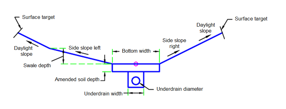 Starting at the attachment point, the swale is built using the input parameters. If the surface target is set, the daylight surface is found (only for cut situations). If include underdrain is set to Yes, then the underdrain is built.