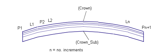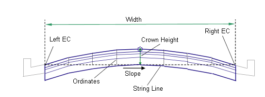 The center of the string line is calculated by subtracting the Crown Height from the attachment point, and the left and right edges-of-traveled-way are calculated by applying the Width and Slope symmetrically about the attachment point. The ordinates of the parabolic curve are calculated at even intervals along the string line, and straight line links are added to connect the ordinate points. Parallel surfaces are inserted for the Pave1, Pave2, Base, and Subbase surfaces from the given depths.