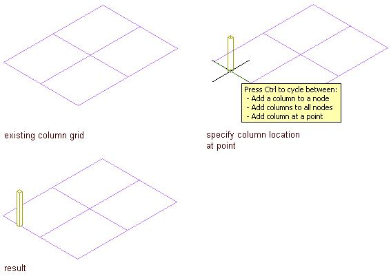 add a column at a particular point on or within the grid | press Ctrl twice, move the cursor to the point where you want to add the column, and click. If the Properties palette value for Specify roll on screen is Yes, move the cursor to roll the column around its extruded axis as desired, and then click; or enter a value for the roll angle, and press Enter. A positive value rolls the column counterclockwise around its extruded axis when viewed from its end (top) to its start (bottom). |