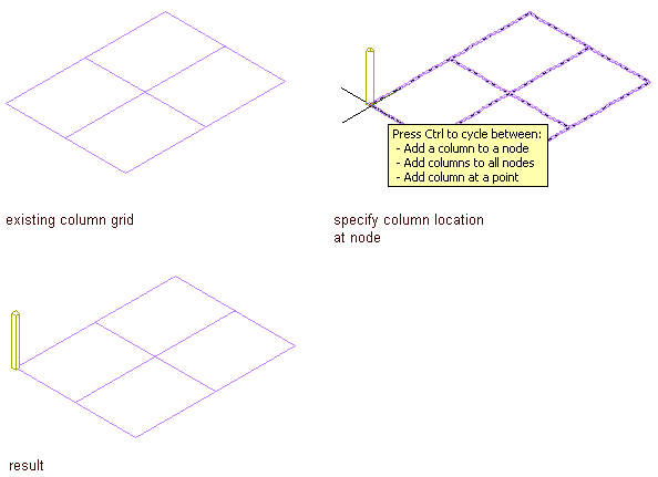 Use this procedure to anchor a column to a grid as you create it, with property settings that you specify. The style specified in the tool provides the column shape. When you specify an insert point on the grid, the shape is extruded in a positive direction along the current UCS Z-axis to a height determined by the Start offset, End offset, and Logical length properties of the tool.
