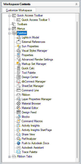 - In the Workspace Contents pane, click the plus sign (+) next to the Palettes node to expand it.
