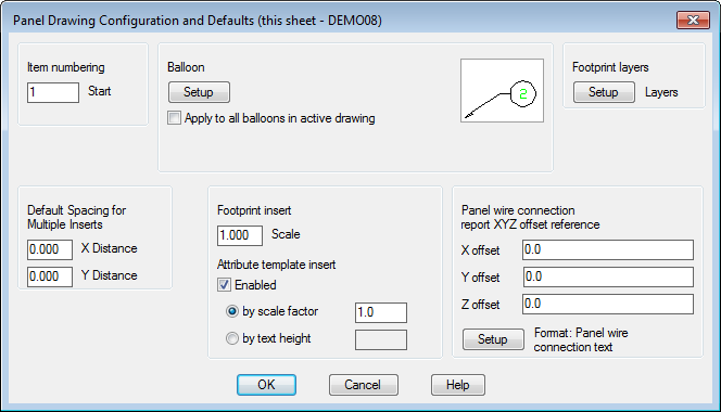 When inserting a nameplate you can associate it to a panel footprint. Values from the footprint, such as Tag, installation, location, and descriptions, are copied from the footprint. However, you can assign an item number and catalog value specific for the nameplate.