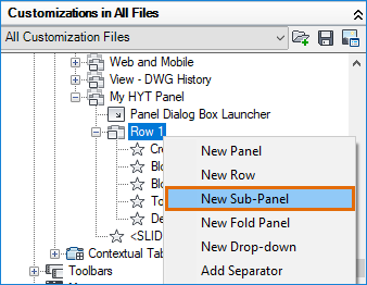 In the CUI Editor, locate the newly created ribbon panel (My HYT Panel), if necessary.