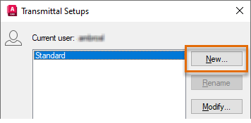 In the Transmittal Setups dialog box, select the Standard transmittal setup and click New.
