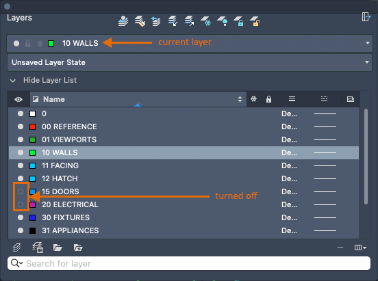 In the visibility column, notice that the circle icons for two layers are not filled in. These layers were turned off to hide the doors and electrical wiring in the floor plan.