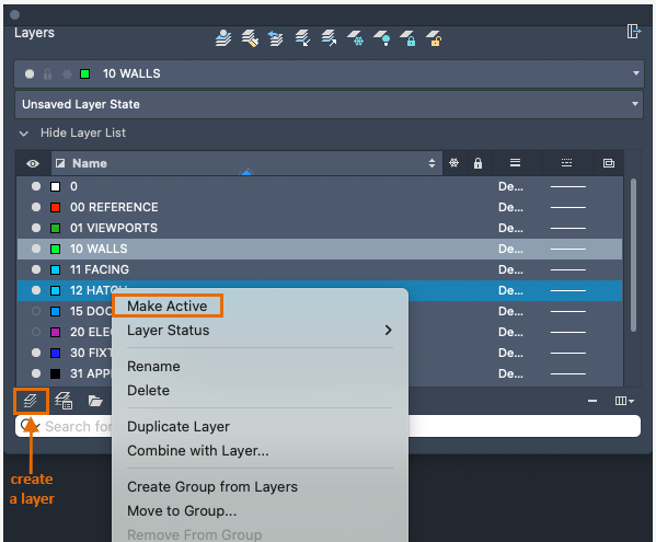 To create a layer, click the button shown and enter the name of the new layer. To change the current layer, double-click the layer name or right-click the layer name and select Make Active.
