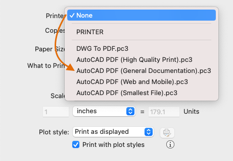From the Printer/plotter drop-down list, choose AutoCAD PDF (General Documentation).pc3: