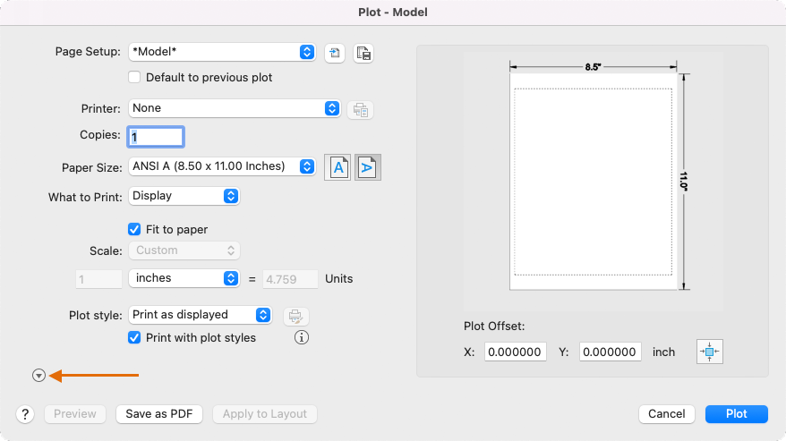 To control whether all of the options in the Plot dialog box are hidden or displayed, click the arrow indicated to expand.