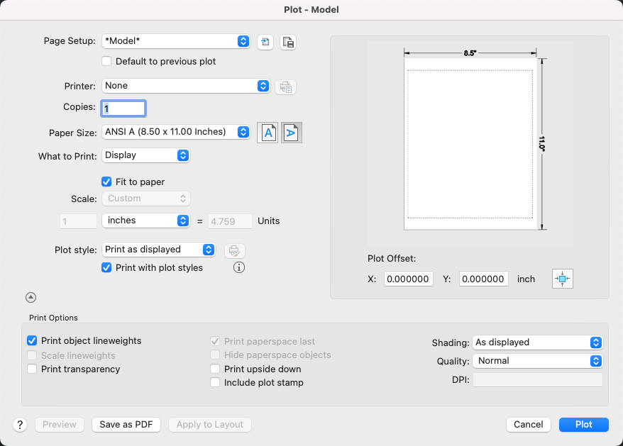 After you are satisfied with your plot settings, save them to a page setup with a descriptive name such as "PDF-monochrome." Then, whenever you want to output to a PDF file, all that you need to do is click Print, choose the PDF-monochrome page setup, and click OK.