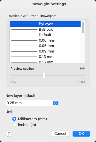 Sets the current lineweight, sets the lineweight units, controls the display and display scale of lineweights, and sets the DEFAULT lineweight value for layers.