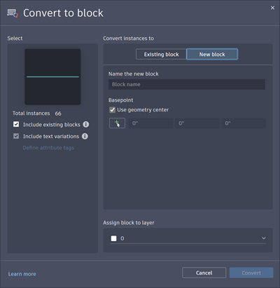 You can also convert the source object or the selected instances to a new block. In the Convert dialog box, define a new block by specifying a block name and insertion point. By default, the insertion point is set to the center of the selected geometry.