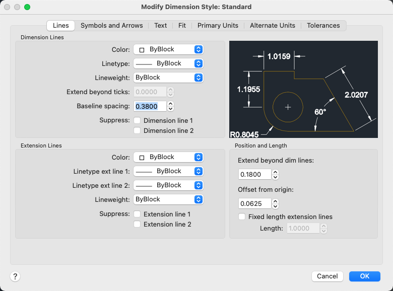 Sets the format and properties for dimension lines, extension lines, arrowheads, and center marks.