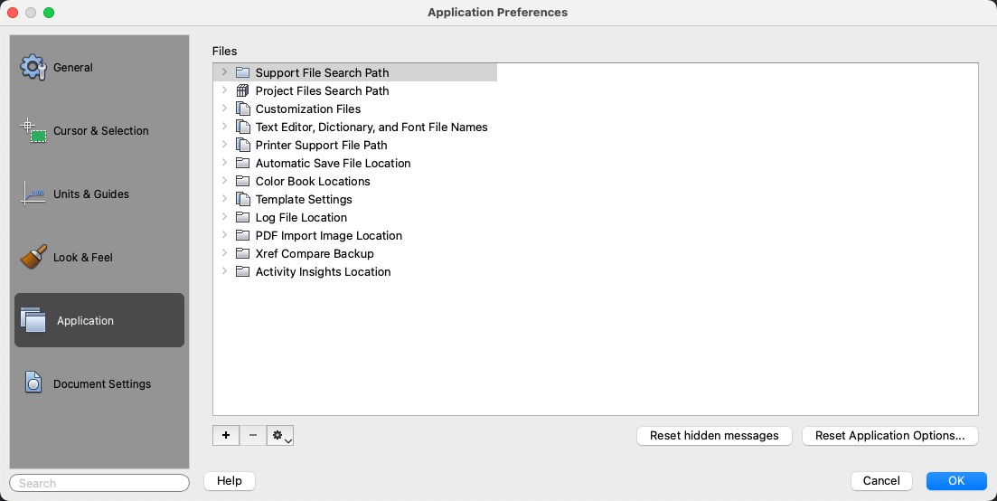 Lists the folders in which the program searches for support, driver, menu, and other files. Also lists optional, user-defined settings such as which dictionary to use for checking spelling.