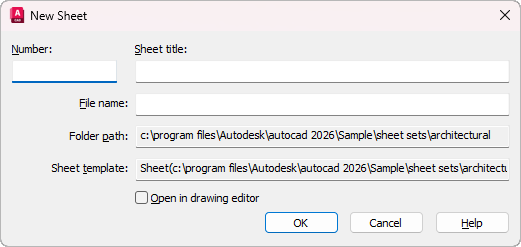 Specifies the sheet number. It is recommended that you do not fill in the sheet number when you first create a sheet. By default the drawing name and layout name of the new sheet will be the sheet number together with sheet title.