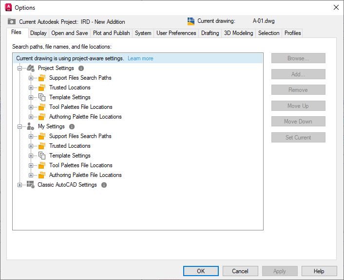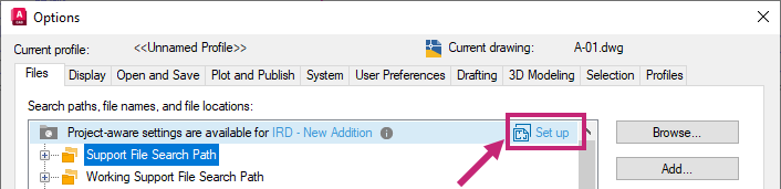 Note: If you don't see the Set Up option, the project might have previously been configured. This can be verified by the appearance of the text "Current drawing is using project-aware settings."