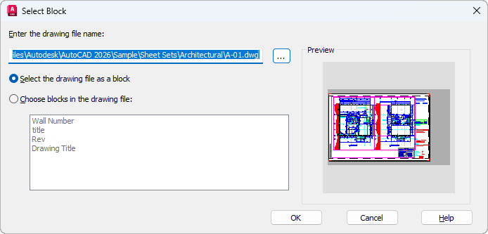 Uses a selected block definition from the specified drawing file or drawing template file.
