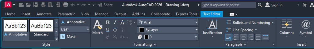 When you select a certain type of object or start certain commands, a contextual ribbon tab is displayed instead of a toolbar or dialog box. The contextual tab closes when you end the command.