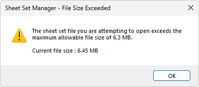 If the DST file exceeds 6.3 MB, the sheet set will not open. A modal dialog appears with a warning that the file size limit has been exceeded.