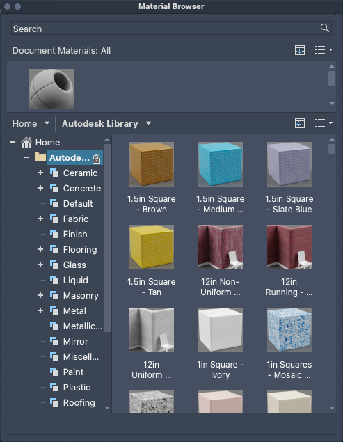 The standard Autodesk materials library is are accessible from the Materials Browser.