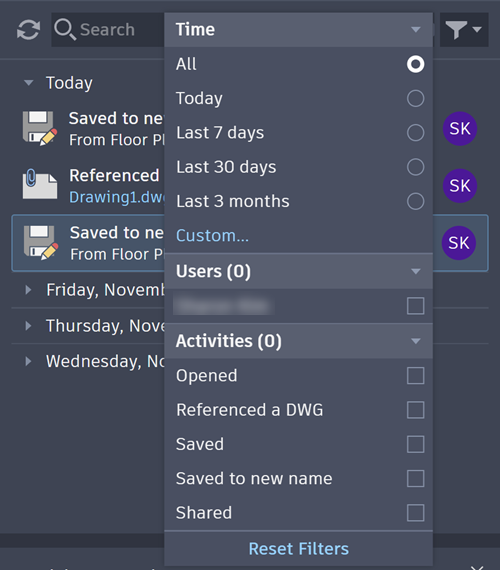 You can also right-click any activity to quickly filter by the user who performed the activity or by the same type of activity.