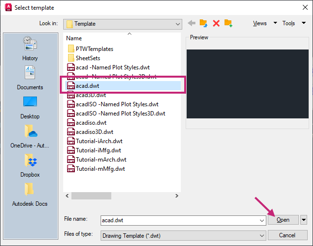 In the Select Template dialog box, select acad.dwt from the Files list and click Open.