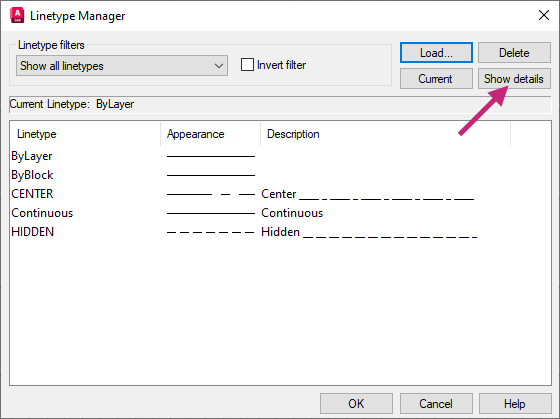 In the Linetype Manager dialog box, click Show Details.