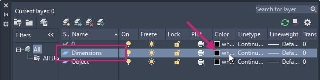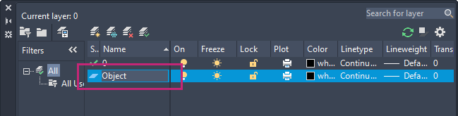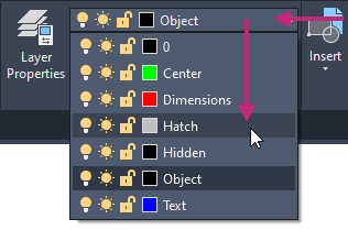 On the ribbon, click Home tab > Layers panel > Layers drop-down list and choose Object.