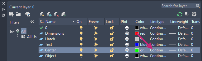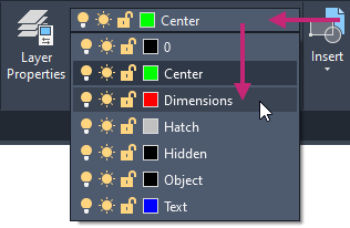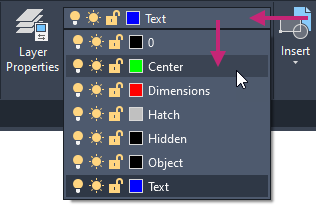 On the ribbon, click Home tab > Layers panel > Layers drop-down list and choose Center.
