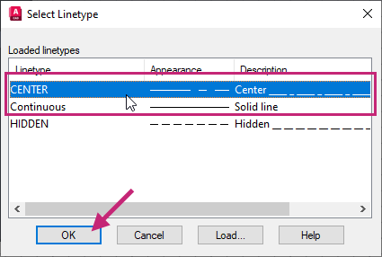 In the Select Linetype dialog box, select CENTER and then click OK.