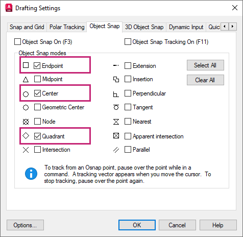 Under the Object Snap Modes section, click Endpoint, Center and Quadrant.